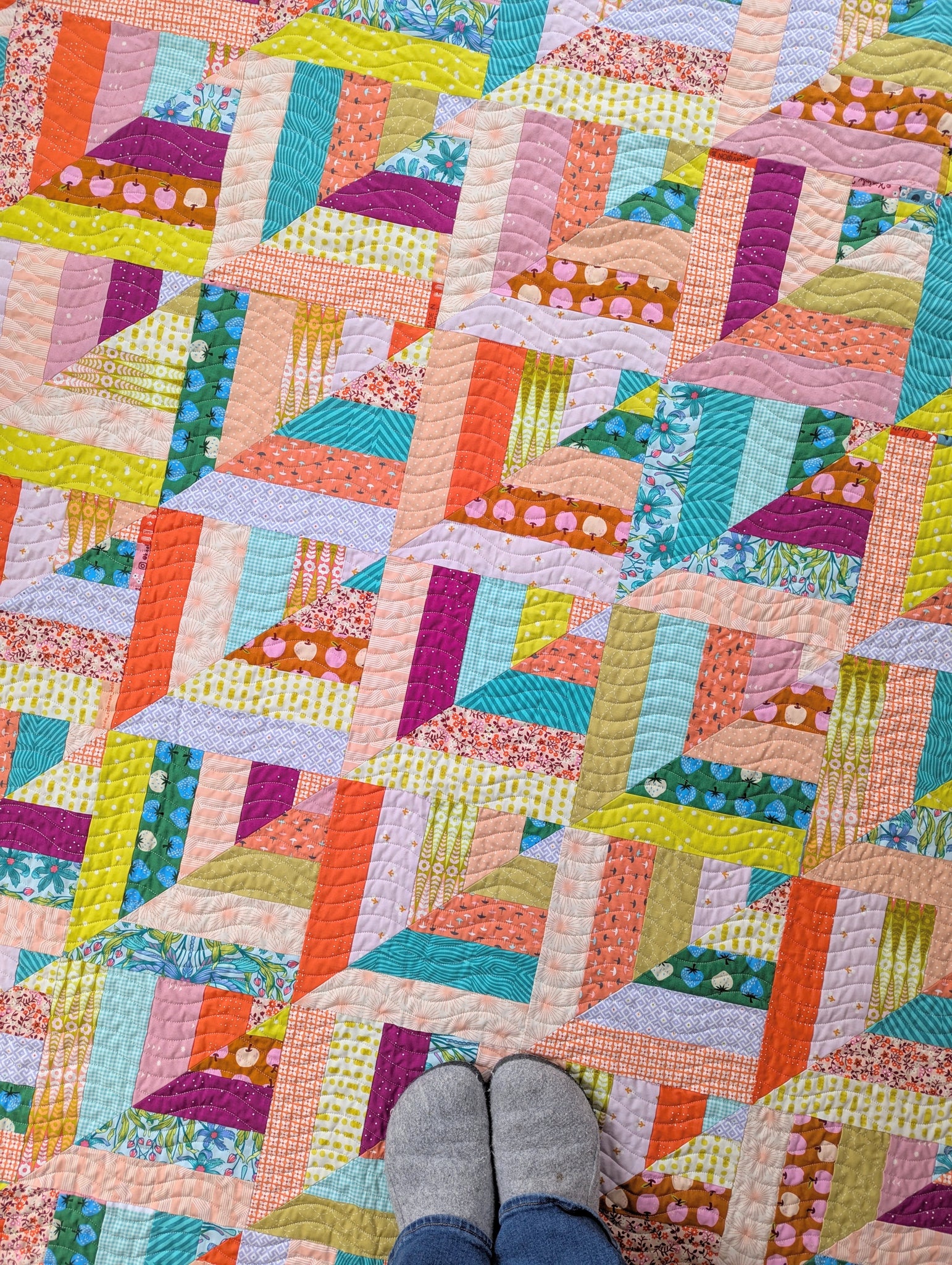 A large throw sized quilt made from the Lucky Log Cabins quilt pattern by Emily Dennis of Quilty Love.