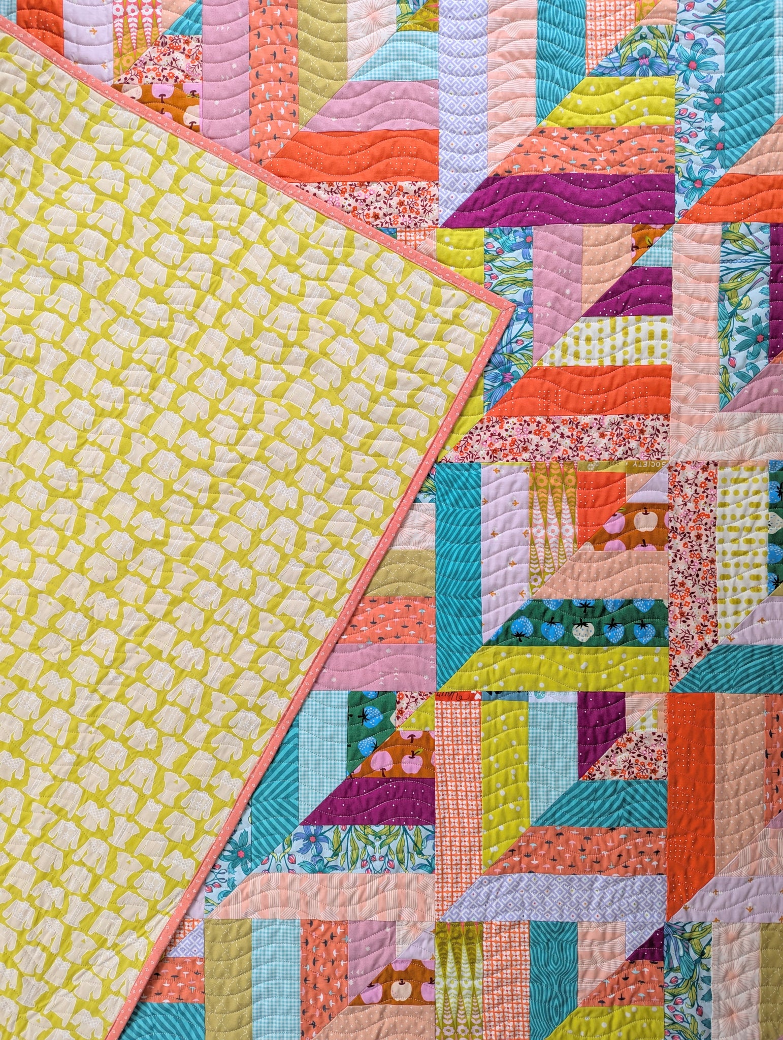 Fabric: A scrappy mix of orange, yellow, pink, peach, green, and purple